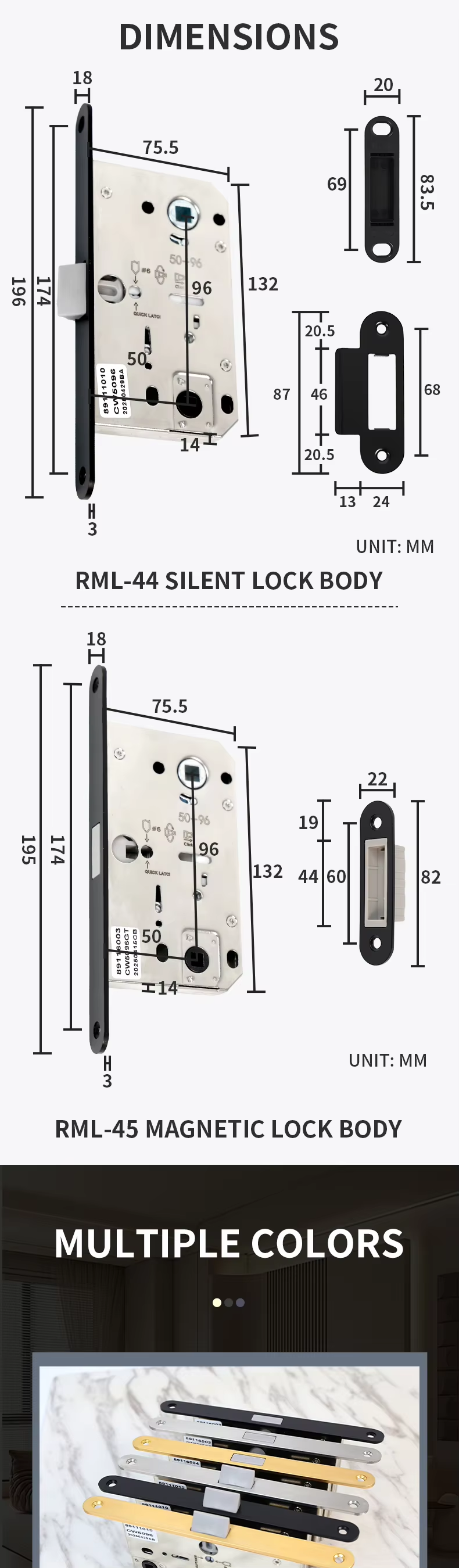 RML-44 RML-45 9650 Hole Distance Silent Magnetic Color Plate Deadbolt Invisible Latch Lock Body
