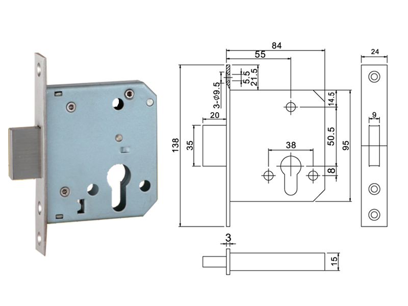 RML-19 55ZD 單方舌鎖體,歐標(biāo)葫蘆孔,鎖芯開啟方舌